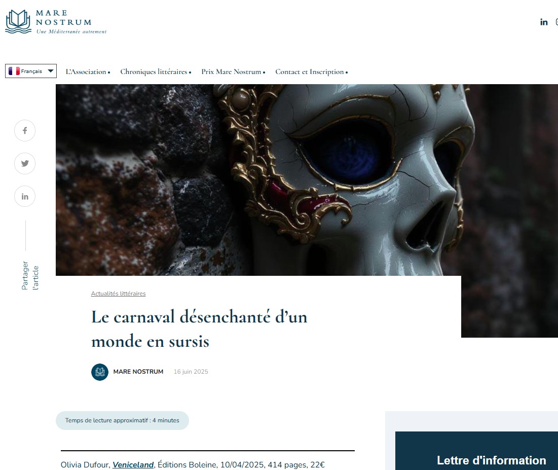 Sur le blog "L'élégance des livres", Evlyne Leraut recommande vivement Veniceland, en soulignant l'importance des sujets qui y sont abordés (01/09/2025) :