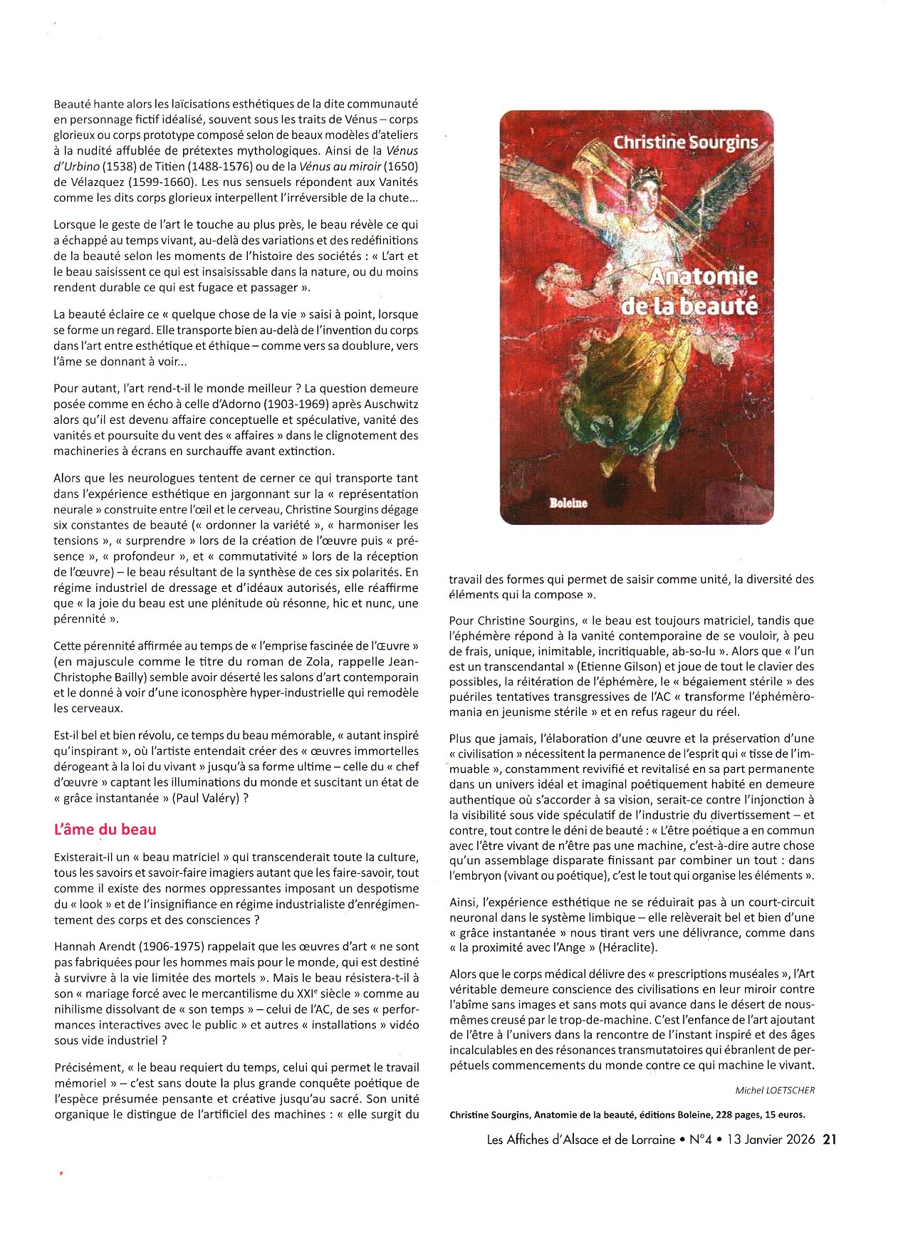 Michel Loetscher manifeste dans un article détaillé la portée de l'ouvrage Anatomie de la beauté en rappelant combien la beauté peut être aujourd'hui détournée et incomprise. Comme Christine Sourgins, il désire ouvrir la voie à une reconnaissance du beau authentique. Et pour comprendre le beau il faut le questionner. : « Si toutes les images ne manifestent pas la force d’ébranlement de l’œuvre d’art, comment se fait-il "qu’il y ait de l’art" qui, soudain, nous saisit, nous ouvre le monde voire nous "provoque à être" ? Pour Christine Sourgins, "l’expérience du beau, en nous faisant vivre une vérité, procure une puissante saisie de soi par ce que nous regardons" ».