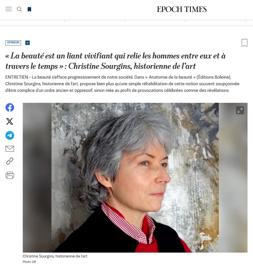 Epoch Times : "La beauté est un liant vivifiant qui relie les hommes entre eux et à travers le temps" : Christine Sourgins, historienne de l'art (27/10/2025)