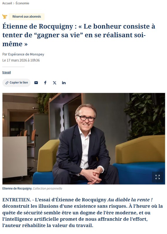Le Figaro : "Étienne de Rocquigny : « Le bonheur consiste à tenter de “gagner sa vie” en se réalisant soi-même »" (17/03/2026)